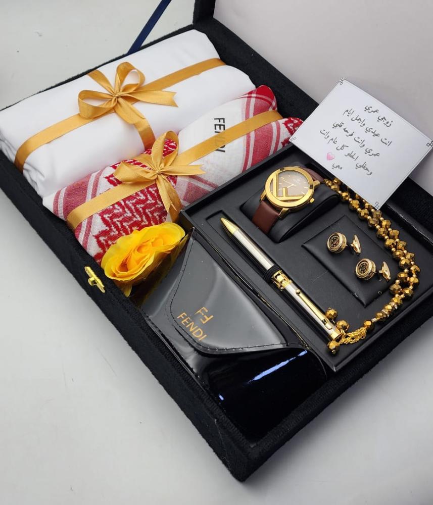 بوكس هدية من فندي قماش فندي صيفيخامه ممتازه جدا مع الزراير واليبرات شماغ فندي خامة ممتازة مقاس ٥٥ او ٥٨ و ٦٠نضارة فندي مع الملحقات ساعه شكل فنديضد الماء ضمان سنهقلم وكبك انيقسبحهتغليف مجانا عبارة حسب الطلب