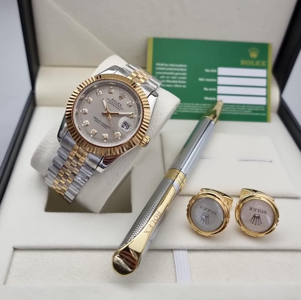 طقم ساعه رولكس وقلم وكبك رولكسساعةكبكقلمسير ستيلماكينة بطاريهالدرجه الاولئملحقات رولكس ( علبة + كيس ) مجاناًالشحن والتوصيل مجاني لجميع مدن المملكة 🇸🇦🚛